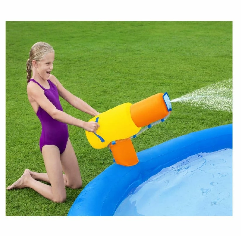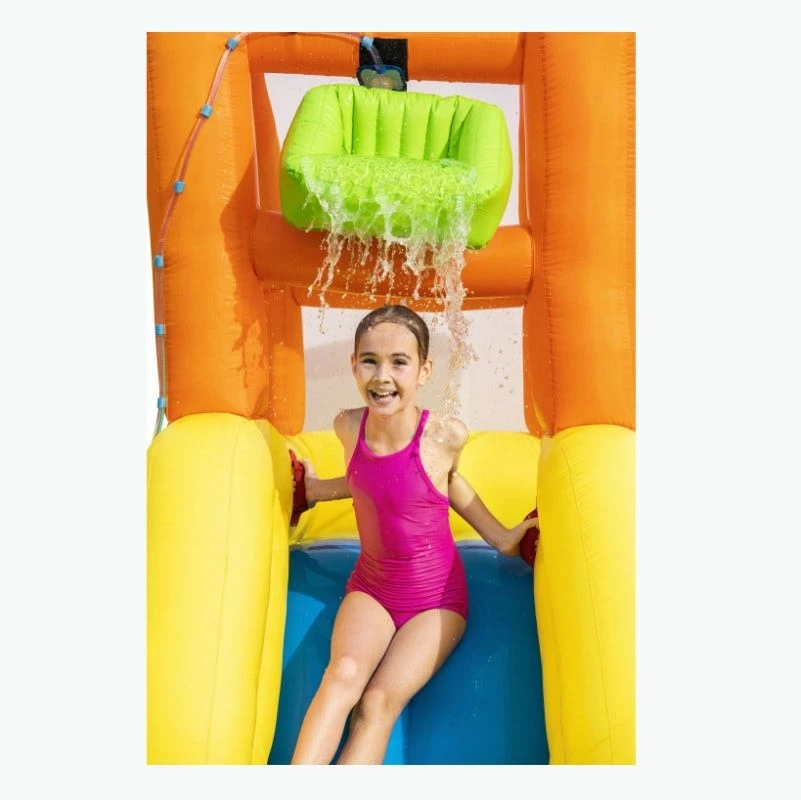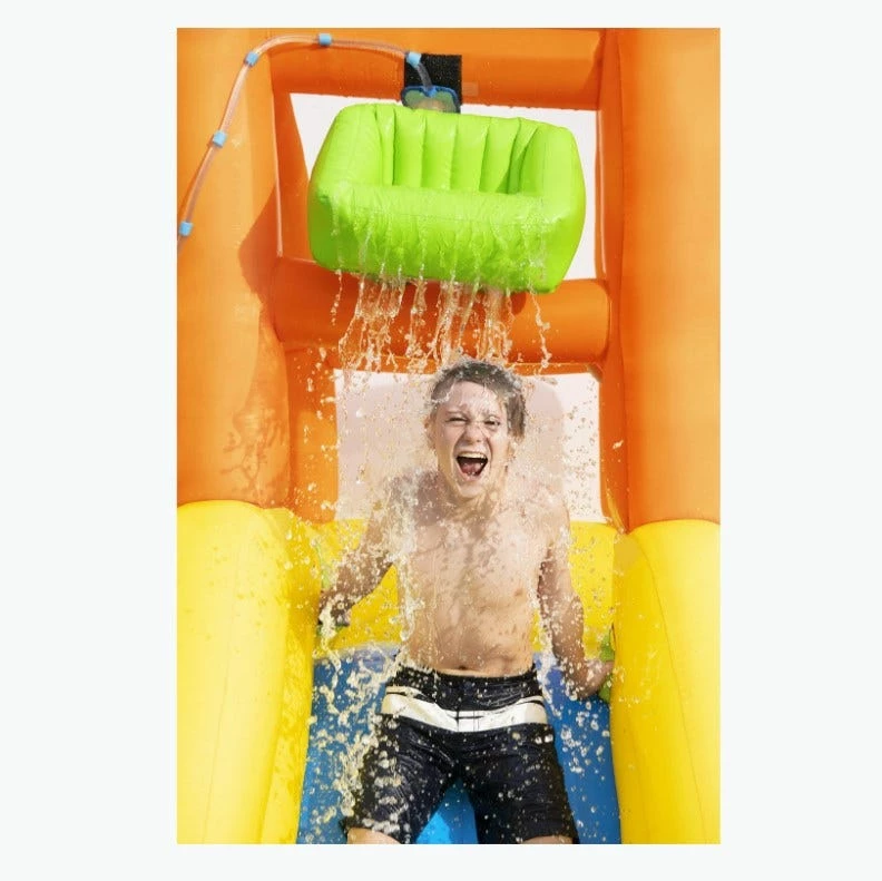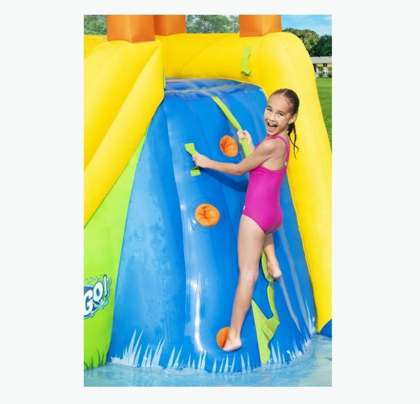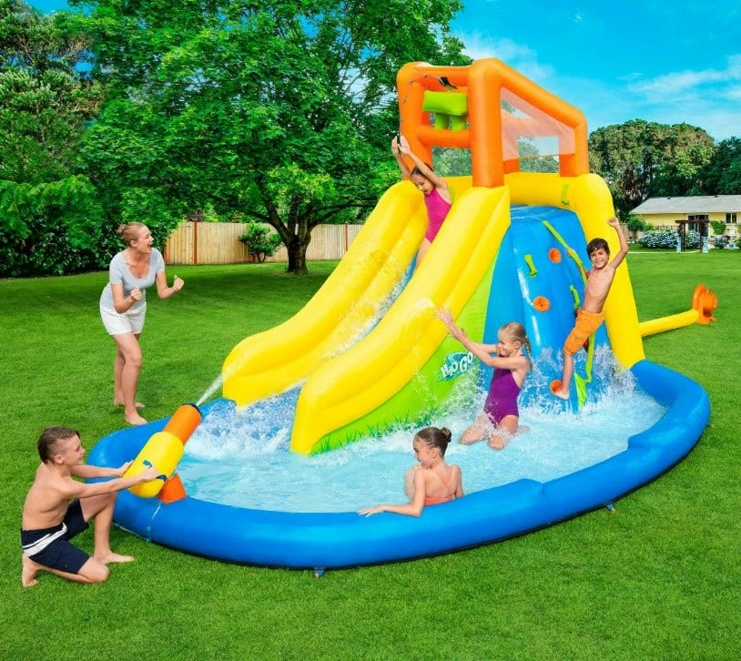 Come take a trip up Mount Splashmore, where the splashes are big, and the smiles are even bigger! This Mega Water Park from H2OGO!® has got more fun features than you can count on one hand. With a climbing wall that has footholds, along with a climbing rope, and a giant slide, kids will have a blast spending their day out in the sun. There’s a spontaneous dump bucket at the top of the tower to randomly soak kids as they’re sliding. Plus, a water blaster at the bottom to spray the slide and friends! The extra large play pool at the bottom is the perfect place for splashing and lounging. The best part of all… the included blower inflates this whole thing in less than two minutes! Next vacation destination: Mount Splashmore!