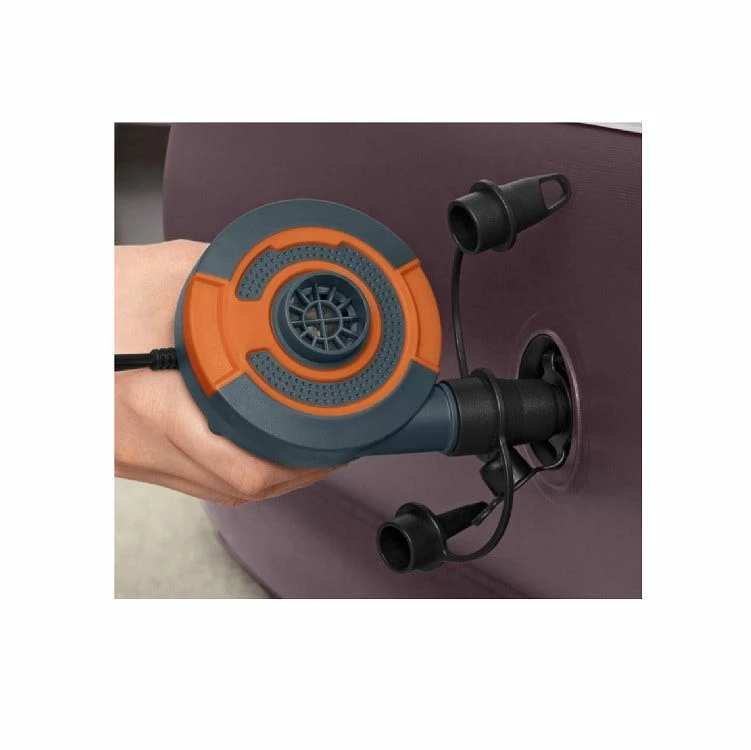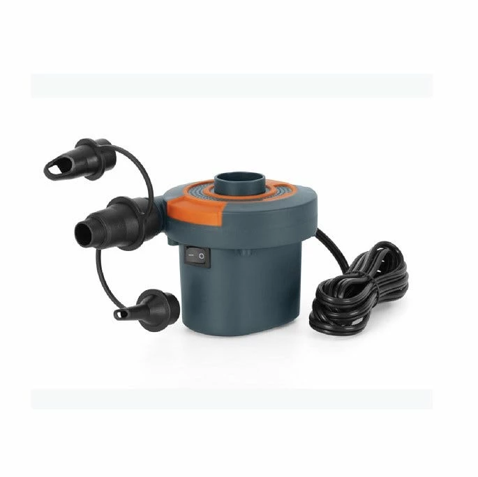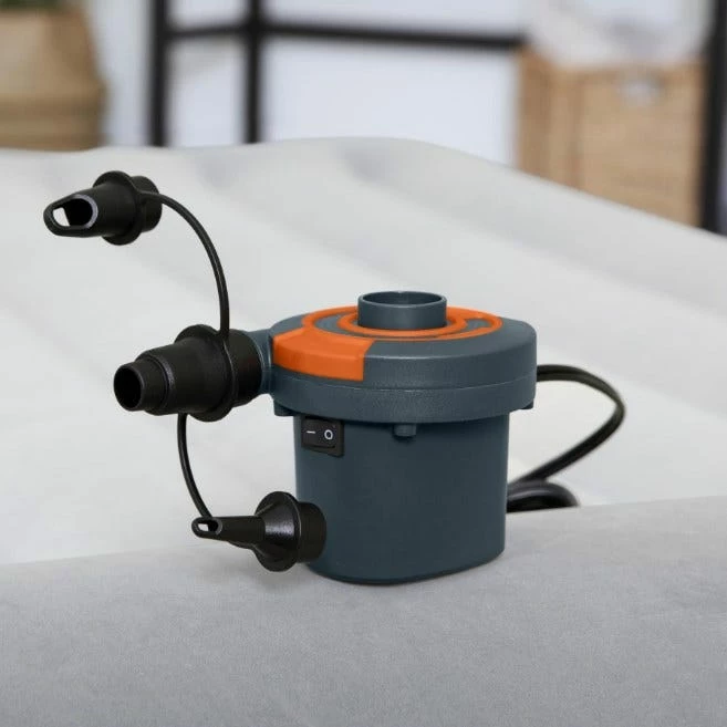 The Bestway® Sidewinder™ AC Air Pump, with an attractive two-color gray and orange design, is a great way to inflate or deflate your favorite inflatable products while on the go! This air pump comes with 3 multi-purpose valve adapters that are compatible with many products, including airbeds, pool toys, camping mats, floats and more. The AC cord is powered by a 110-120V household outlet for convenient use. This electric pump is designed to provide maximum airflow for fast, easy, effortless inflation and deflation. Great for in home use.
