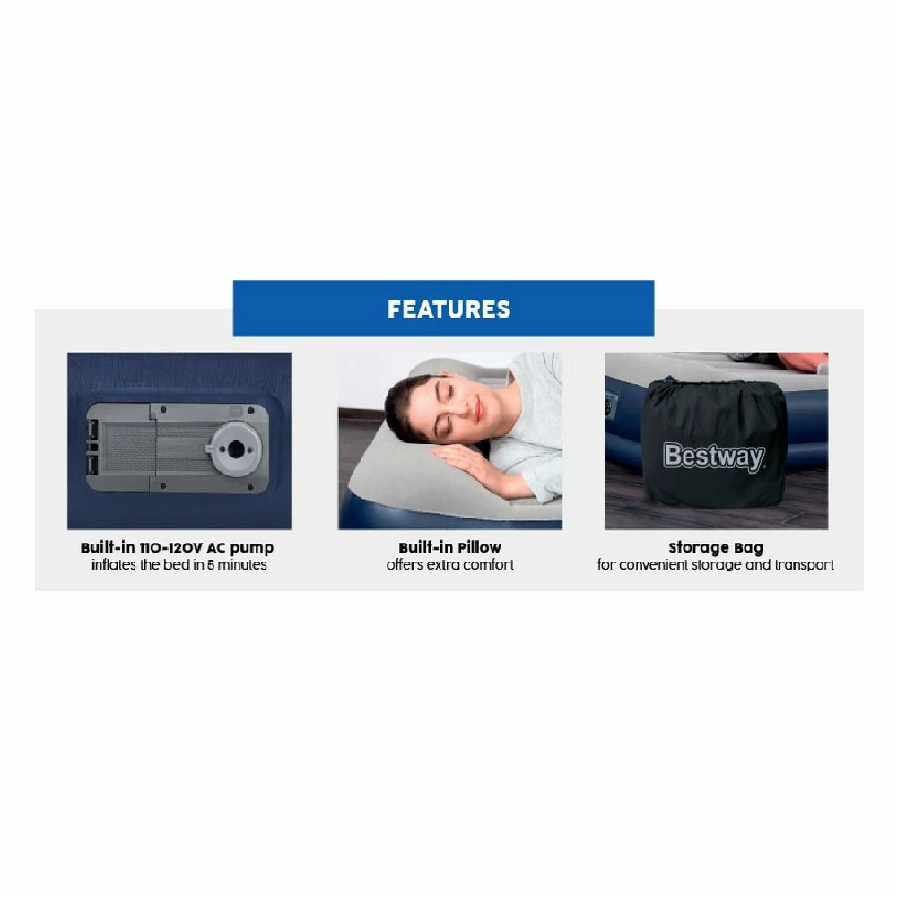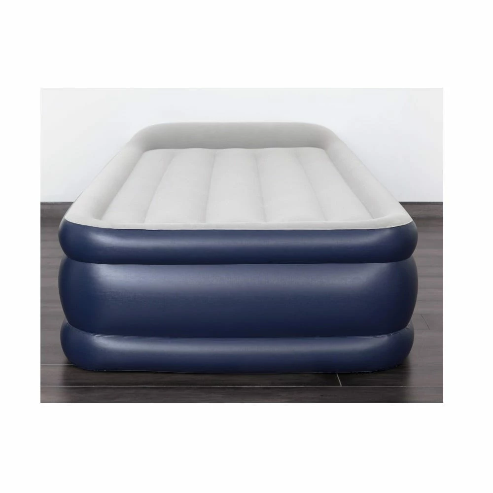 Wake up renewed and refreshed on the Bestway® Tritechâ„¢ Air Mattress! This 18 in. (46 cm) tall, Twin-sized bed promises strength, durability and comfort all night long. Its compact size and built-in pump make it quick and convenient for use whenever you need it. Durable ConstructionWith a comfortable sleeping surface and sturdy construction, along with a built-in pillow, a great night’s sleep is right around the corner. The internal structure of this bed is made with Tritechâ„¢ material offering durability and strength, while also allowing the mattress to keep the same shape no matter how many times it’s inflated and deflated. Specifically engineered for firmness, this material minimizes air loss throughout the night. The specialty Tritech material increases internal stretch-resistance and provides contoured support for all night comfort. This durable, stress-tested material can withstand all of the weight and movement that comes with a great night’s sleep. Simple SetupThis air mattress inflates in 3 minutes so it is ready for bed when you are. The built-in pump allows for easy inflation, and the quick deflate screw valve allows for easy deflation after use. Simply place your flattened bed in the included carrying bag for easy transport and storage.
