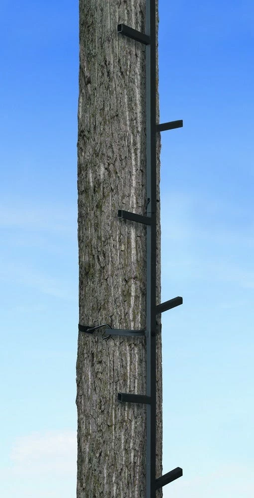 Safe, quiet and easy assembly are the main focus features of Big Games Quick-Stick Climbing System. This system allows you to hang and climb to your tree stand safely and silently from the ground, eliminating any unnecessary maneuvering and climbing. Built with our Rock Solid design in mind, these all steel welded sticks are held secure to the tree with five one-inch Cam-Buckle Nylon straps, while the five sleeved sections with large alternating angled steps help you easily climb the 20 Feet to your stand in no time. With an overall weight of only 20 pounds, this system holds a weight rating of 300 pounds.