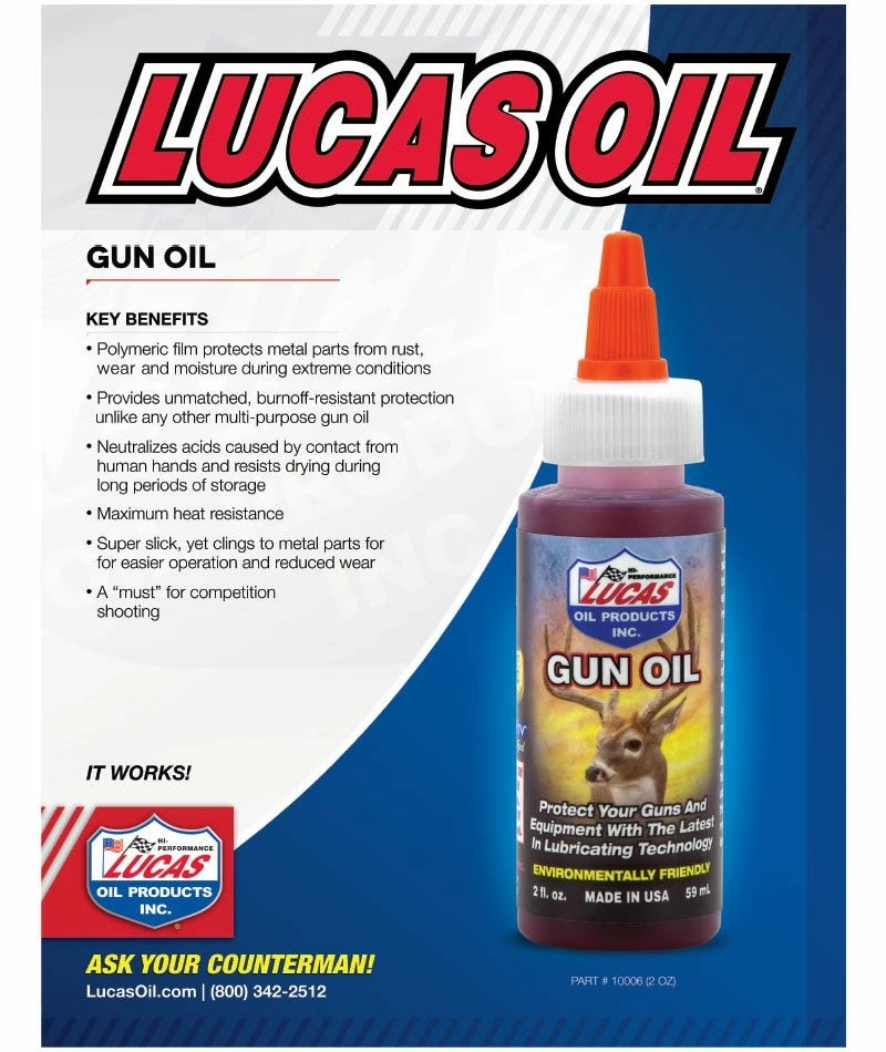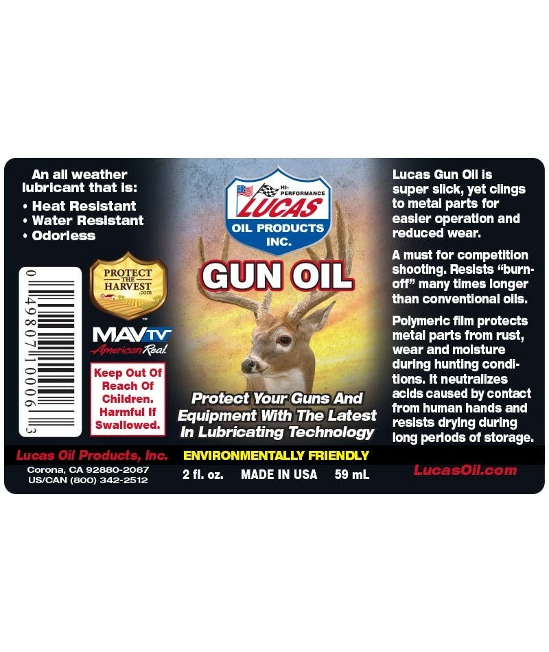 Used and recommended by major firearms manufacturers, Lucas Oil Original Gun Oil is an all-weather, environmentally friendly lubricant. Great for general lubrication on all sporting arms such as pump, over/under and side by side shotguns, bolt and lever action rifles and revolvers. This oil is odorless which makes it ideal for use on hunting firearms.