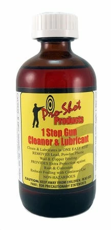 Pro-Shot 1 Step Solvent/Lube 8oz 1-STEP-8 formula leaves barrels Totally clean and protected. The Solvent targets lead, powder, plastic, copper (jacketed), and primer fouling