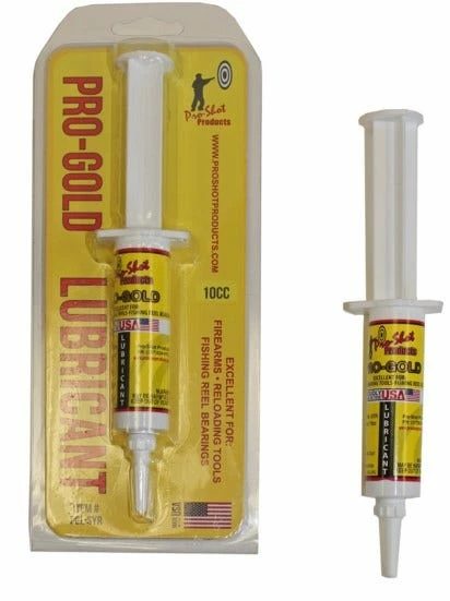 The Pro-Shot 10CC Pro Gold Lube Syringe PGL-SYR contains the well-known Pro Gold grease in an easy to use syringe. Can be used to protect and lubricate stainless, chrome molly, nickel, and blued firearms.