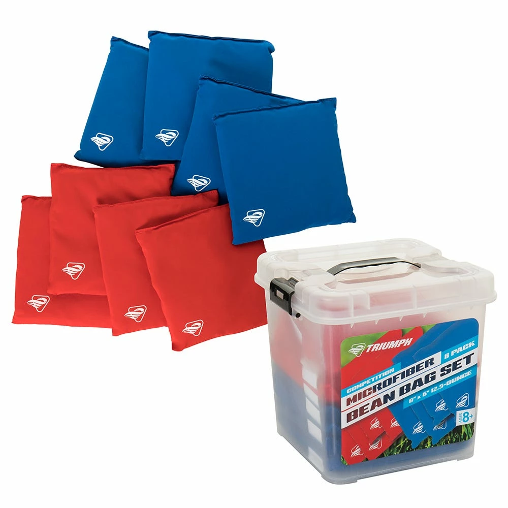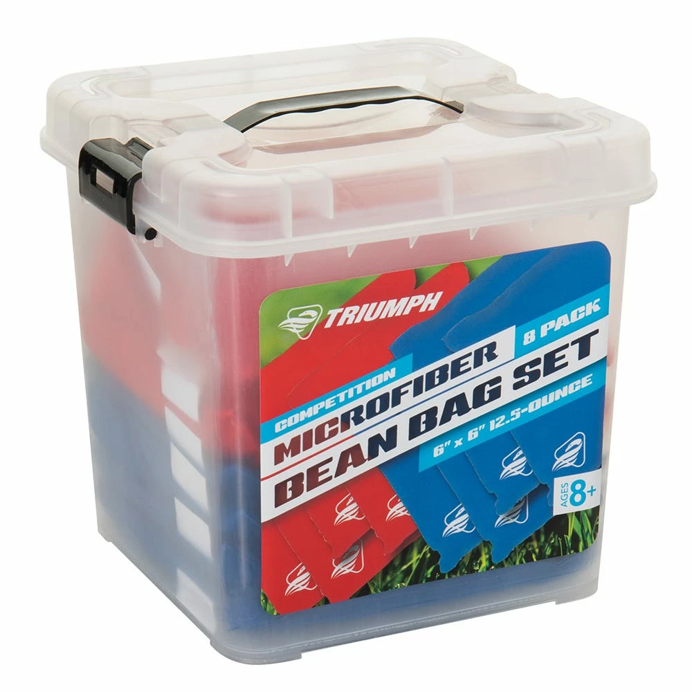 Skip the stress of searching for missing pieces to this classic outdoor game. The Triumph Competition Microfiber Bean Bag Set are the perfect upgrade or replacement bean bags for any bean bag toss game. The four red and four blue microfiber bean bags weigh 12.5 ounces. The 6″ square bean bags are durable, allowing you to spend more time enjoying playing with family and friends. When you’re finished playing, easily transport and store both sets of bean bags in the included clear plastic storage container with two locking clasps.